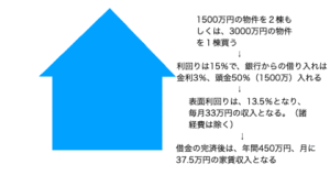 そうすると、利回りが15%で1500万円の物件を金利3%で買います。物件価格50%(1500万)の頭金をいれて2棟買えば、毎月約33万円の収入となります。(実際は、修繕費や経費がかかったりするので、もっと少なくなりますが)