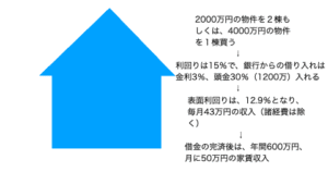 利回りが15%で2000万円の物件を買います。金利3%で物件価格30%(1200万)の頭金をいれて2棟買えば、毎月約43万円の収入となります。